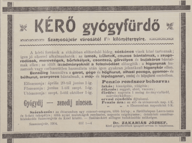 A gyógyfürdő a XIX. század második felében dr. Zakariás József, fegyházi orvos tulajdonába került, aki minden energiáját és vagyonát a létesítmény modernizálásába fektette. A Czakó-forrás mellé egy újabb kutat létesített, amely a Bánffy-forrás nevet viselte. Továbbá a fürdőhelysnek volt két vendéglője, szabadtéri tánctere és padokkal ellátott sétatere (parkja) is.[4] Kérő fürdő és Szamosújvár között óránként közlekedett társaskocsi.